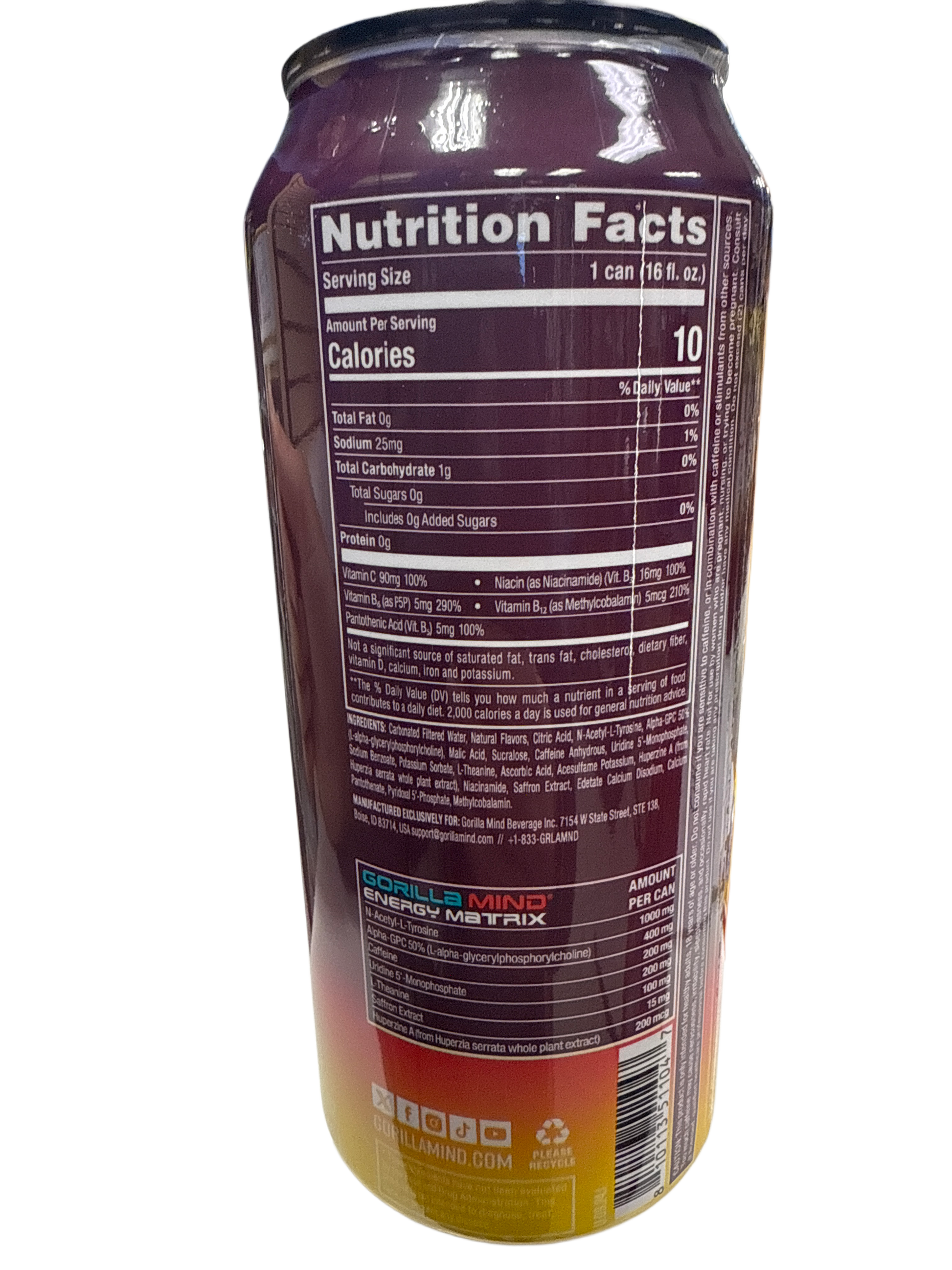 Cada lata de 473ML está llena de ingredientes diseñados para claridad mental, energía suave y rendimiento máximo, incluyendo cafeína natural, aminoácidos y nootrópicos. Gorilla Mind Energy destaca en el mercado de bebidas energéticas de EE. UU. por combinar sabor, funcionalidad y calidad, ofreciéndote más que solo un subidón de azúcar.