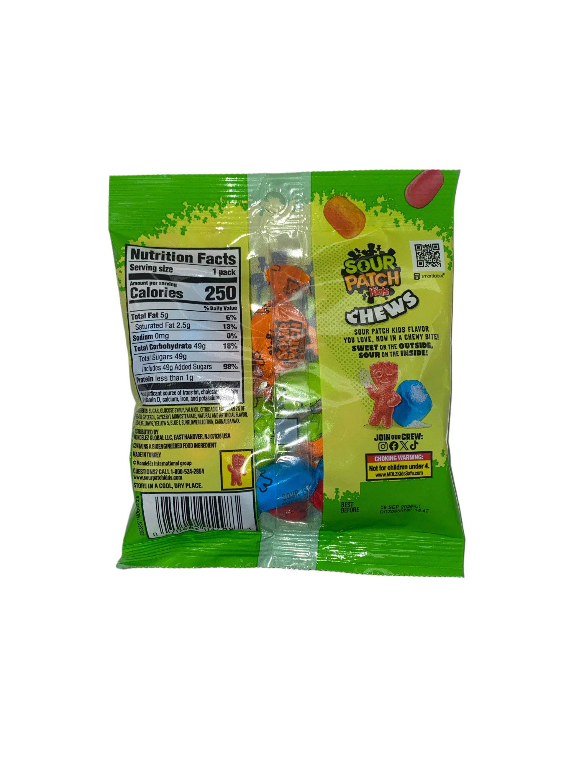 Prepárate para una versión más suave y blanda de un clásico dulce ácido con Sour Patch Kids Chews Candy 60g – Edición Turquía. Esta versión internacional ofrece el icónico sabor ácido a dulce por el que Sour Patch Kids es conocido, pero en un formato de dulce masticable que es un poco diferente a las gomitas estándar.