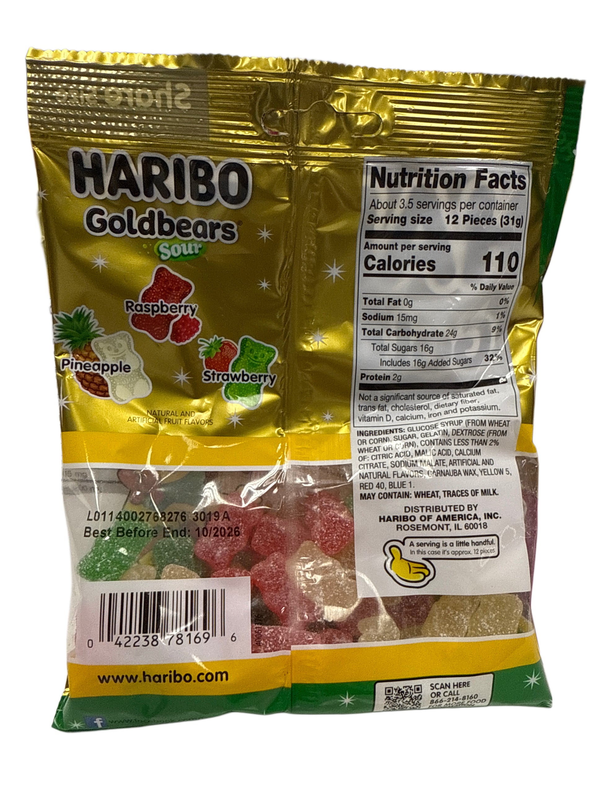 Célébrez la saison des fêtes avec une touche acidulée grâce aux Haribo Christmas Sour Goldbears 102 g – Édition U.S. ! Ces oursons gélifiés festifs allient la texture emblématique des Haribo Goldbears que vous adorez à un coup de fouet acidulé ludique — parfait pour les amateurs de bonbons qui aiment un mélange de sucré et d'acidulé à chaque bouchée.