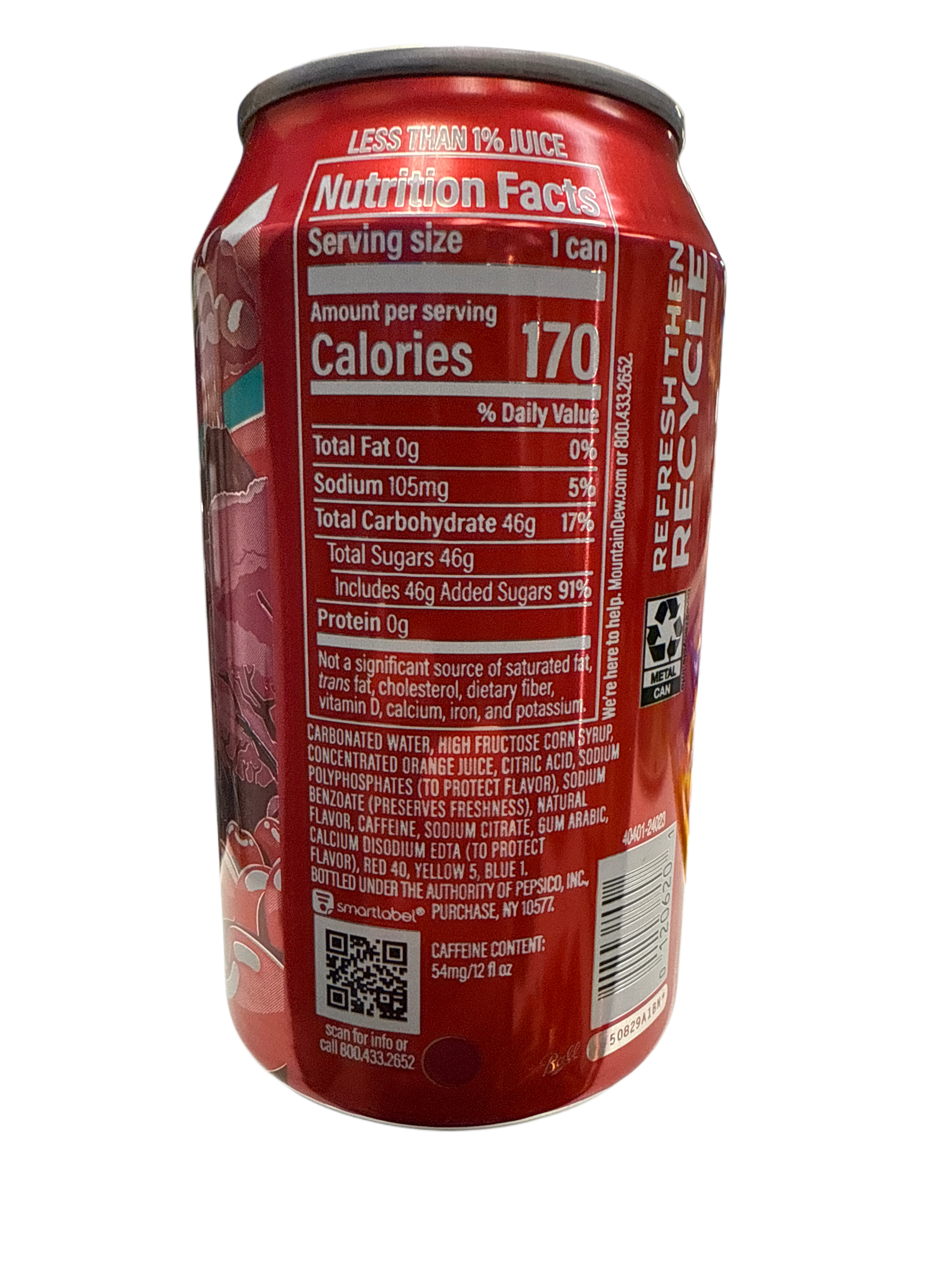 Mountain Dew Code Red är en elektrifierande smakexplosion som tar den klassiska Mountain Dew-upplevelsen till nya höjder. Förpackad i en praktisk 355ml-burk kombinerar denna ikoniska läsk den citrusdoftande kicken från Mountain Dew med en rush av körsbärssmak, vilket skapar en djärv och uppiggande smaksensation.